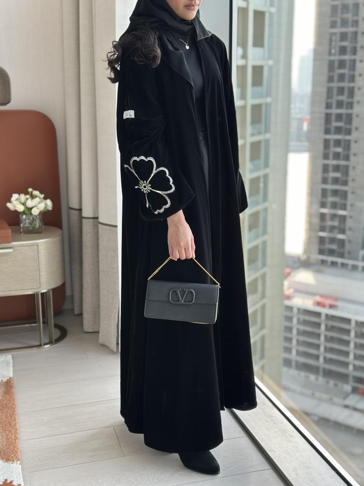 عبايه بقماش المخمل مع اضافه الورد المطرز بالعبايه والشيله ، الملحقات : طرحه